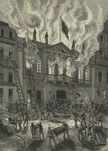 On the night of 20 March 1888, the theatre was completely destroyed by a fire that broke out behind the stage. It was almost full for a benefit show for the actor Firmino Rosa, which included the performance of a comic opera. Following demands for an encore the scenery had to be reset and it was while this was being done that one of the backdrops caught fire. The fire spread rapidly, there was intense smoke and general panic, and people could not see where to go to escape because the gas lighting had been turned off and because there was no direct route to the exit at the rear, meaning they could not be guided by lights from outside. About 120 people died and the fire consumed the entire theatre in a few hours. There were significant delays to the arrival of the firefighters.[1][2][3][4][5][6]