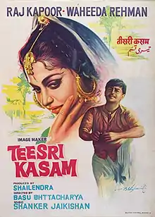 Teesri Kasam (transl. The Third Vow) is a 1966 Hindi language drama film directed by Basu Bhattacharya and produced by lyricist Shailendra. It is based on the short story Mare Gaye Gulfam, by the Hindi novelist Phanishwarnath Renu. The film stars Raj Kapoor and Waheeda Rehman. The duo Shankar–Jaikishan composed the film's score. The film's cinematography was done by Subrata Mitra, dialogues were written by Phanishwarnath Renu and the screenplay is by Nabendu Ghosh.