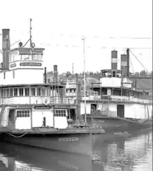 Logger, on right, distinctive for having two chimneys. Henderson, on left, with a single chimney, showing more common engineering layout, both at the dock of Shaver Transportation Company, in Portland, Oregon, in 1940.