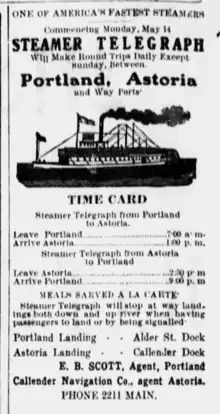 In May 1906, Telegraph was advertised as making a daily run from Portland to Astoria, Oregon, at way landings up and down river if there were passengers to land, or if signaled.[15] Telegraph was to depart from Portland at 7:00 a.m. and arriving at Astoria at 1:00 p.m.[15] Returning, Telegraph was to depart Astoria at 2:30 p.m. and arriving at Portland at 9:00 p.m.[15] The Portland landing was the Alder Street Dock, and the Astoria Landing was the Callendar dock.[15] Meals were advertised to be "sarved [sic] a la carte."[15] E.B. Scott was the Portland agent, and Callendar Navigation Co. was the Astoria agent.[15]