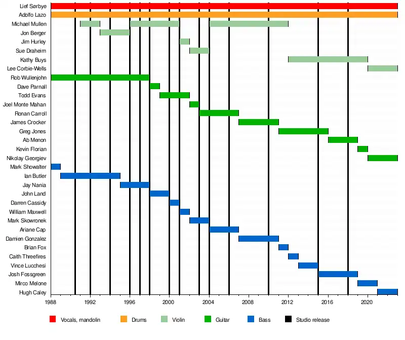 The band formed in 1988 with Lief Sørbye (mandolin, vocals), Adolfo Lazo (drums), Rob Wullenjohn (guitar), and Mark Showalter (bass). The band has seen a changing cast of musicians, with Sørbye and Lazo being the only two constant members throughout the duration of the band's existence.