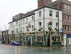 Historic England considers the pub building and the attached former brewhouse to be of early 19th century construction, with a western extension fronting Vicar Lane being added later in the century.[1] In 1927, the owner, John William McGonnell, sold the pub to the Leeds-based Melbourne Brewery. It contracted the architects Garside & Pennington of Pontefract to design a full refurbishment and remodelling, which took place during 1928. This added the faience ground-floor facades, using tiles from the close by Burmantofts Pottery, and introduced the majority of the features in the present-day interior. Works included opening up and inter-linking the ground floor spaces, relocating a Tudor-style fireplace to the first floor, laying a terrazzo floor in the hallway, and changes to the staircases and doors of the upper floors, which contain a landlord's flat and former hotel accommodation.[1]