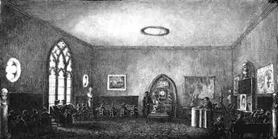 Bronson Alcott's Temple School, opened in 1834 in the former Masonic Temple, corner Tremont St. and Temple Place, Boston. Engraving by Pendleton's Lithography