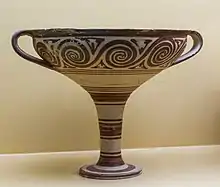Stemmed kylix (inv. P 21243), Late Helladic IIIA, probably early 1400s BC, with a spiral pattern derived from Minoan models, found in the Mycenaean chamber tomb under the Temple of Ares.[139]