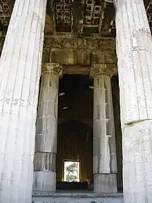 Pronaos of the Temple of Hephaestus, Athens. The bottom drum of the right interior column derives from the Temple of Ares and was incorporated into the Temple of Hephaestus during restoration work in 1937.[40]