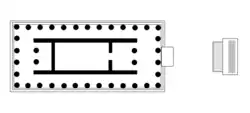 The dimensions of the foundations and the architectural fragments indicate that the temple was a Doric hexastyle peripteral temple, i.e. it had a colonnade extending around the whole exterior, with six columns at the front and rear ends and thirteen columns along the north and south sides. The pronaos at the eastern end of the temple contained two columns between the antae and a door to the cella and was unusually deep (4.65 metres).[44] It was matched by a shallower, closed opisthodomos at the western end.[45][46] The whole structure stood atop a three-step crepidoma, which was 1.068 metres high.[45][46] At the bottom step of the crepidoma, the superstructure was 34.961 metres long by 16.125 metres wide; the building itself was 32.847 long by 14.052 metres wide.[46] The height of the temple from the bottom step to the cornice was about 9.7 metres.[46] The design is similar to the Temple of Hephaestus above the Agora on Agoraios Kolonos hill, but slightly larger.[47]