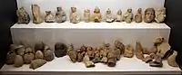 At the top of the steps is a statue of Cybele enthroned, with a turreted crown and lion attendants. This is consistent with a colossal, fragmentary statue of the goddess, found within the temple precincts. The goddess' meteoric stone may have been kept on a pedestal within the temple cella; or incorporated into the face of a statue and set on a pediment.[4] This stone was known as the acus Matris Deum or the needle of Cybele, described by Servius as being "conical in shape, of a deep brown color" with the appearance of molten rock and sharp to a point.[5] This acus is identified by Servius as a pignora imperii, one of the seven sacred objects which maintained imperial rule.[6]