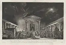 In the 18th and early 19th centuries, the Temple of Isis in Pompeii served also as the subject of written depictions and illustrations, many of which romanticized and exoticized the Egyptian cult center.[22] One particular book written by Giambattista Piranesi in 1804, Antiquités de Pompeìa, includes illustrations of Egyptian symbols which are not historically accurate to what has been excavated at Pompeii and depictions of the Temple of Isis at a much larger than factual scale.[22] Another illustration of the Temple of Isis from Jean Claude Richard de Saint Non's 1782 volume of Voyage Pottoresque, ou, Description desroyaumes de Naples et Sicile also features a gross misrepresentation of the temple's size.[22] Its intense shadowing and looming clouds only contribute to the Egyptomanian tendency to mystify and marginalize Egypt as it compares to post-Englightenment European notions of religion. Photographs of the temple's ruins, taken by archeologists and compiled in the "Pompeii in Pictures" webpage demonstrate the disparity in size between these illustrations and the physical space itself.[29]