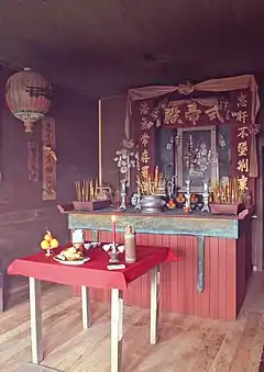 The temple is dedicated to the deified Han Dynasty general known in Cantonese as Kwan Tai (or Guan Di in Mandarin) and holds in its main altar an image of Kwan Tai flanked by generals Liu Bei and Zhang Fei, decorated in shell and glass on a black fabric background. A table in front of the altar holds five pewter altarpieces. Signboards recording prayers and donations are displayed on the temple walls, a collection of flags, drums, and baskets stands to the left of the altar, and the room also holds two wooden benches and a furnace for burning offerings. Taoist mandalas hang in the two front windows.[3][4][7]
