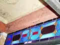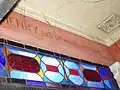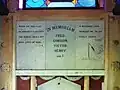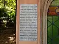 The interior contains a sarcophagus surmounted by the carved figure of a dog. Both the interior and exterior have numerous leaded memorial and pacifist inscriptions.[2]