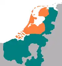 Territory of the United Provinces c. 1590 (orange), at the height of the Spanish Reconquest under Parma (turquoise).