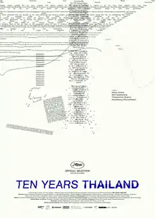 Ten Years Thailand is a 2018 Thai independent dystopian anthology film written and directed by Aditya Assarat, Wisit Sasanatieng, Chulayarnon Siriphol and Apichatpong Weerasethakul. Based in format on the 2015 Hong Kong film Ten Years, its four segments each offers the director's speculative take on a dystopian Thailand in 2028. The film was shown in the special screenings section at the 2018 Cannes Film Festival.[2][3] A fifth segment, by Chookiat Sakveerakul, was not completed in time for the Cannes screening.[4]