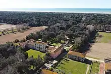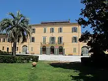 When contracted by Maria Luisa in the late 1810s, Nottolini designed a large landscaping project which covered the pine forest area known as Pineta di Levante, stretching for some 4 km along the sea coast from Viareggio to the border between the duchies of Lucca and Tuscany.[54] Its axis was to be a large avenue parallel to the coastline, with perpendicular paths and specific areas designed for different types of vegetation.[55] Some sources state that the centre of the estate was to be a hunting cottage,[56] but others refer to a grandiose residential design, a palace intended to impress.[57] Carlo Ludovico asked Nottolini to scale down the project. Eventually the residence was to consist of 3 separate buildings; the central one was intended as residenza signorile, to be flanked by 2 other buildings supposed to accommodate servants and as stables, magazines, workshops, a forge, a carriage house and similar. In the 1840s the central edifice was enlarged with side wings, which connected all 3 buildings.