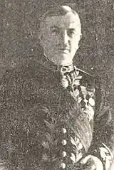 Arana's strategy did not work. Biscay branches of mainstream parties accused him of siding with Basque separatism.[88] Basque nationalists remained adamant and negotiations on would-be electoral alliances failed.[89] The Carlist Junta Central, in 1918 largely decomposed and disoriented, banned alliances with "enemies of Spain"; Arana blamed Ignacio González de Careaga, another Carlist politician from Bilbao and at the time the secretary of Junta Central, for instigating a campaign against him.[90] In early 1919 the Biscay Junta Señorial declared that they were not obliged to follow recommendations from the Madrid headquarters; Arana issued a manifesto which voiced both against designs of "Estado Vasco" on the one hand and against "régimen centralista y opresor" on another.[91] The conflict seemed solved when Jaime III returned from wartime house arrest in Austria and dissolved the central executive, result of the long-standing fray with the Mellistas.[92] However, Arana was already tired; quoting health reasons he handed the new party leader Pascual Comín his resignation note. He took part in the grand Carlist rally known as Magna Junta de Biarritz before in December 1919 his request was granted.[93]