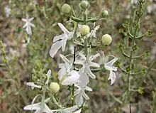 As is the case with many Lamiaceae, Teucrium racemosum uses gynodioecy as a method of reproduction.[11] Gynodioecy is a breeding system consisting of male and hermaphroditic plants in a population.[12] Gynodioecy occurs as a consequence of genetic mutation that prevents a hermaphroditic plant from producing pollen, while keeping the female reproductive parts intact.[13] In gynodioecious species, female plants often have much smaller anthers (the part of the stamen where pollen is produced) and as a result produce little to no pollen, whilst in hermaphroditic flowers both male and female sexes are functional.[14] Genetic conflict often arises in these plants, and it is a common observation for female plants to produce more seeds and healthier, higher quality seed than the hermaphroditic plants.[15] This is thought to be because of the extra energy that female plants have access to as a result of not producing pollen.[14] Gynodioecy is an extremely rare form of reproduction, with the Teucrium racemosum being part of just 1% of all plants that exhibit a gynodioecious mating system.[16] Flowering occurs from September to June.[3]