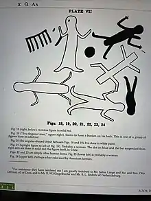 Amanda Julia Estill (1882–1965) was a white Texas-American teacher who served as a member and eventually became the president of TFS in 1923.[13][14] Estill was one of the first members to publish information regarding Native American culture in Gillespie County.[14] In this piece, as published in the 1925 collection history entitled, Happy, Hunting Ground, she recounts the combative history between Native American Comanches and neighboring whites with Gillespie County.[8] In doing so, she historicizes the pioneering efforts of Julius Lange, a German Mill owner. Estill collects his stories describing bouts with "savage Indians" who would "capture or kill... pretty pioneer maidens with long flowing hair".[8] While Estill highlights several instances in which Native peoples appear to attack several white families, she also discusses Native American weaponry and writings in grave detail. For example, she mentions how indigenous subjects would dip arrows in the poison from venomous snakes to ensure the fatality of their victims when pierced.[8] Within the concluding pages, Estill includes several reiterations of what she calls Native American "scribe".[8] As depicted in figure one, nearly all of her characterizations represent Native Americans harming white subjects. Estill's writings serve to distribute racial stereotypes amongst broad audiences by solely depicting the perspective of while settler colonials, a negative attribute often seen in the folklore genre.[15]