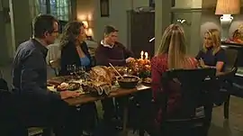 Bennet family Thanksgiving dinner; they are arguing with Claire about her decision to leave school.