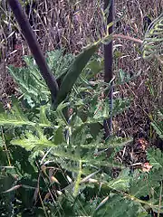 The leaves, like the name of the species suggests, are hairy. The leaves around the base of the stem have well-developed sheath-like petioles about 20 to 80 mm (0.79 to 3.15 in) wide. Like the leaves, they are also hairy. They are whitish, yellowish, green, or (rarely) purple in color. The leaf blades are triangular to deltoid in shape and are pinnate, subdivided once to thrice. The last leaflet subdivision is usually about 8 to 32 mm (0.31 to 1.26 in) wide in T. villosa var. villosa; while they are only about 1.5 to 3 mm (0.059 to 0.118 in) wide in T. villosa var. dissecta.[4] The margins of the leaves are curled (revolute) with small teeth-like and triangular serrated edges, each tipped with small spike. The main leaf midrib (rachis) is densely covered in hair and light to dark green on the upper side, while it is smooth and grayish to greenish on the underside.[4] The leaves are largest at the bottom and progressively become smaller the higher they are on the stem.[9] In the upper parts of the stem, the leaves are often reduced to nothing more than petioles which form sheaths around the stem.[10]
