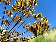 Like other members of the genus, the inflorescence of Thapsia villosa is a compound subhemispherical to globose umbel. It has 9 to 29 spokes and is about 6 to 12 cm (2.4 to 4.7 in) in diameter. Bracts are usually absent, though in rare cases, one to three may be present, each around 6 to 40 mm (0.24 to 1.57 in) in length and lanceolate in shape. The umbellules are hemispherical to globose. Bracteoles are also usually absent, though rarely 1 or 2 may be present. Each umbellule has about 18 to 43 flowers, each with five bright yellow elliptical petals. The fruits are oblong and around 9 to 15 mm (0.35 to 0.59 in) long and 6 to 11 mm (0.24 to 0.43 in) wide. When mature, they are light to dark brown in color with four yellowish to brownish wings characteristic of the genus.[4][9][10] The main umbel has hermaphroditic flowers, containing both stamen and pistil. Smaller umbels may develop from the sides of the stem which usually contains only stamens. These umbels wither away quickly.[5]