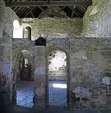 The rectangular Blue Lias stone building has a stone tiled roof. It is 12.4 metres (41 ft) long and 6.6 metres (22 ft) wide.[3] The ground floor had three rooms, one larger than the others which had a fireplace, and a door in the southern wall.[3] The larger room was the hall and linked by arched doorways to the smaller rooms.[21] There were two rooms on the first floor, which were damaged in the fire of 1884, which also has a small entrance door which was accessed via exterior stone steps which no longer exist. There was also a latrine in a turret which no longer exists.[21] There are small traceried arched windows.[2]