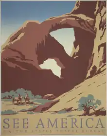 - ↑ The "See America First" slogan came into being in the fall of 1905, and was officially launched on January 25, 1906 at the "See America First" conference organized by the Salt Lake City Commercial Club.[13][15] With the motto "See Europe if you will, but see America first," the aim of the conference was "to devise a plan to divert at least a portion of the travel of Americans which now goes to Europe and other foreign countries, to their own country first."[16] The importance of the objective to state industry was underscored by some of the conference's speakers: Governors George Earle Chamberlain of Oregon, Albert E. Mead of Washington, and John Christopher Cutler of Utah, along with former Utah Governor Heber Manning Wells.[15] The movement quickly became widespread; in 1911, at the urging of Governor Austin Lane Crothers of Maryland, President Taft agreed to write a letter in support.[17][18] By the time of Blank's writing, "See America First" was no longer identifiable with any one concentrated campaign. It had become a phrase in the common vernacular[19][20][21][22][23] and used in multiple promotions, such as in a circa 1936–39 series of seven posters created by the Federal Art Project for the United States Travel Bureau, each emblazoned with "See America" and depicting various national parks.[13] Carol's decision to "be a strong advocate of See America First" was likely more an endorsement of the general movement than a response to any one individual promotion.