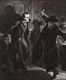Mycroft Holmes, Sherlock Holmes, Lestrade, and Watson confront Colonel Walter, 1908 illustration by Arthur Twidle