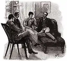 Holmes, Watson, Annie Harrison and Percy Phelps, 1893 illustration by Sidney Paget in The Strand Magazine