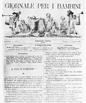It was originally published in serial form as The Story of a Puppet (Italian: La storia di un burattino) in the Giornale per i bambini, one of the earliest Italian weekly magazines for children, starting from 7 July 1881. The story stopped after nearly 4 months and 8 episodes at Chapter 15, but by popular demand from readers, the episodes were resumed on 16 February 1882.[1] In February 1883, the story was published in a single book. Since then, Pinocchio has been one of the most popular children's books and been critically acclaimed.[1]