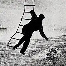 In finalizing the theatrical footage and publicity stills of the rescue scenes shot at Niagara Falls, Estabrook's film editors employed special effects, using multiple exposures to add animated silhouettes of Rodney hanging on a rope ladder suspended from his airplane.[15] Studio editors also superimposed images of Bow's face onto the water's surface near the falls' edge. In its pre-release promotion of the film in April 1925, the Exhibitors Trade Review highlights a frame from those "thrilling" scenes and describes it as "a fine example" of the film's "unusual photography".[15] After the film's release, some reviewers did not find the effects used for the rescue scenes convincing. Robert Sisk of Variety, the entertainment industry's most widely read paper at the time, simply states in his June 17 review that the rescue's presentation is "Faked, but interesting".[16]