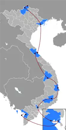 - ^ Lê Xuân Tiền & Đỗ Mỹ Linh were issued two penalties totalling one hour and 44 minutes (90 minutes for failing to complete the Roadblock, and 14 minutes for breaking seven eggs during the Roadblock). They also received a time credit due to production difficulties. However, neither the penalties nor the time credit affected their placement, and it was unaired.[17]