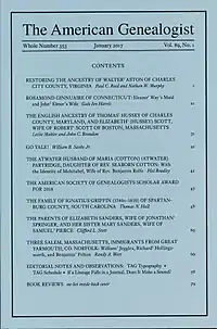 The American Genealogist is a quarterly peer-reviewed academic journal which focuses on genealogy and family history.[1][2] It was established by Donald Lines Jacobus in 1922 as the New Haven Genealogical Magazine. In July 1932 it was renamed The American Genealogist and New Haven Genealogical Magazine and the last part of the title was dropped in 1937, giving the journal its current title. All editors have been fellows of the American Society of Genealogists.[3]