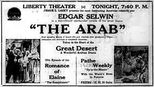 The Arab is a 1915 American silent adventure film directed by Cecil B. DeMille. Edgar Selwyn wrote and starred in the Broadway play version of the story in 1911, and this film is based on that play.[2] Selwyn reprises his role from his play.[3] This film was refilmed by Metro Pictures in 1924 as The Arab. .[4][5]