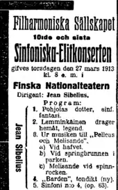 The Bard (in Swedish: Barden), Op. 64, tone poem for orchestra written in 1913 by the Finnish composer Jean Sibelius. It was first performed in Helsinki on 27 March 1913 by the Philharmonic Society Orchestra, conducted by the composer himself, but he revised it in 1914.[3] The new version was first performed in Helsinki on 9 January 1916, again under the baton of the composer.