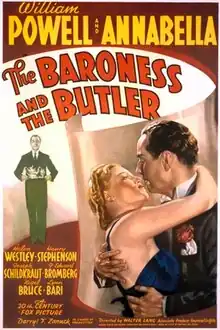 The Baroness and the Butler is a 1938 American romantic comedy film directed by Walter Lang and starring William Powell and Annabella in her American English-language debut. The supporting cast includes Helen Westley, Joseph Schildkraut, Nigel Bruce and Lynn Bari. The film was produced and distributed by Twentieth Century-Fox. It is based on the play Jean by the Hungarian writer Ladislaus Bus-Fekete.[1] [2] It received a generally positive reception from film critics.[3]
