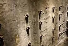 Once constructed, the bathtub walls relied on the presence of the basement floors of the WTC to give lateral support. When these were partially destroyed following the collapse of the Twin Towers during the September 11 attacks, it was feared that removing the resulting debris pile could weaken the walls and cause them to fail, endangering workers and possibly compromising other buildings and flooding a significant portion of the subway system. During the recovery and clean-up operation, dangerous degradation of the walls was discovered, prompting an emergency operation to install tiebacks to the bedrock to shore up the bathtub walls.[2] Excavation of a new Bathtub was conducted between 2006 and 2008, with the new Bathtub reaching 85 feet (26 m) underground.[3]