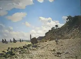 The Beach at Honfleur is an oil-on-canvas painting by French impressionist Claude Monet. The painting depicts a beach on the Côte de Grâce with sailboats, the hospital of Honfleur, and a lighthouse in the distance. In the foreground, a solitary figure in a blue smock stands on the beach. The painting was created with short, thick brushstrokes, typical of Impressionism.[1]