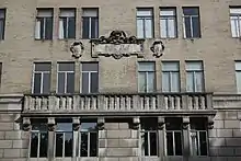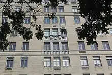 At the 10th and 11th stories, each elevation contains several double-height window groupings, each three bays wide and surrounded by terracotta frames.[38] In each grouping, the 10th-story windows contain false balustrades, while the spandrel panels between the 10th and 11th stories contain a cartouche, winged cherubs, and brackets. In the center bay of each grouping, there is a rosette above the 11th story.[39] At the 14th and 15th stories, there are more double-height window groupings, each three bays wide. Each grouping is flanked by brick pilasters and are topped by a triangular broken pediment surrounding a central grille.[38] There are rosettes on the spandrels between the 14th and 15th stories. The center bay of each grouping contains a projecting balcony at the 14th story; a curved broken pediment with a ram's head above the 14th story; and a cartouche above the 15th story.[39]