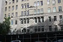The lowest three stories of the facade are made of rusticated blocks of limestone, while the rest of the building is clad with beige brick. The facade's primary elevations face south toward 81st Street and east toward Central Park West.[25][26] This design was intended to take advantage of the building's placement next to the AMNH and Central Park.[25] The north elevation on 82nd Street is simpler in design than the primary elevations, while the west elevation is not decorated.[28] The north, south, and east elevations contain terracotta ornamentation such as pilasters, broken pediments, balustrades, obelisks, and cartouches.[25] There are also motifs such as angels, dolphins, and rams' heads.[1][35] The corners of each elevation are articulated by vertical bands of brick quoins.[25] There are horizontal band courses above the 9th, 12th, and 13th stories; each band course consists of two molded terracotta bands.[28]