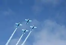 The team flew four Extra 300LPs and an Extra 330SC, the latter being used for solo sections of the performances.[7] These two-seated propeller aircraft were used for four plane displays as well as corporate flying events during which passengers can be carried on board.[8] The aircraft were originally painted orange and black but later changed to light blue and black. By 2013 they had reverted to the orange and black colour scheme.