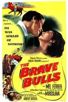 The Brave Bulls is a 1951 American drama film directed by Robert Rossen and written by John Bright. The film stars Mel Ferrer, Miroslava, Anthony Quinn, Eugene Iglesias, José Torvay and Charlita. The film was released on April 18, 1951 by Columbia Pictures.[1][2][3]