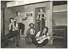 The Bushwhackers, initially named "The Heathcote Bushwhackers", Australia's first "revival" bush band were arguably the catalyst for Australia's folk revival of the 1950s; prior to that revival, similar bush bands, utilizing a mixture of commercially available and sometimes home-made instruments, had performed a social function in rural areas since the late 19th century.[1] The Bushwhackers performed from 1952 to 1957, when founder John Meredith disbanded the group and its members dispersed into other activities. (An unrelated group with a similar sounding name, "The Bushwackers", formed in Victoria, Australia in 1971 and continues to the present day). Over its relatively brief existence, the group evolved from an initial novelty act to one with a more serious mission of presenting and promoting to Australia its neglected bush song heritage, and laid the foundation for similar groups to follow through the 1960s and to the present. Its members also operated—at least initially—from a Marxist / Australian Communist Party ideology, attempting to embody the struggle of the working class against the ruling classes, although this may have been less than obvious to their audiences under the guise of popular entertainment.