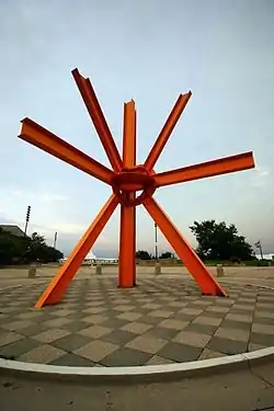 di Suvero's artwork was commissioned by an anonymous donor.[1] It stands tall at 40 feet and is made from steel I-beams, which the artist painted an orange-red color. The sculpture resembles a rising sun, and is colloquially called the Sunburst.[2] It currently sits in O'Donnell Park, next to the Milwaukee County War Memorial building and in front of the Milwaukee Art Museum. When the piece was first commissioned, the Milwaukee Art Museum did not extend to its present location. The sculpture's backdrop consisted of the bluff and Lake Michigan. With the rising sun behind it, The Calling truly captured di Suvero's intent.