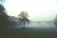 The word 'Carrs' comes from the Old Norse word 'Kjarr' meaning 'meadow recovered from bog' and indicates the original state and subsequent use of the area.[1] Most of the land upon which the park lies was owned by Lord Stamford and part of the Pownall Hall estate until being sold during the period 1841 to 1859.[2] In 1800 a cotton mill was built on the site using the River Bollin for power, by 1828 it was being used to spin and weave silk and in 1903 it was being used as a laundry, it burned down in 1928 and little remains of the building.[3] The park began to take shape in 1925 when Henry Boddington who created Boddingtons Brewery and resident at Pownall Hall gave playing fields to the public, this is commemorated on a stone arch at Chancel Lane. In 1935 Wilmslow Urban District Council bought the land adjacent and established The Carrs Park.[1] The park follows the River Bollin which meanders to Quarry Bank Mill and then to Styal Country Park.[4] Quarry Bank was originally a working mill that took power from the River Bollin and is now owned by the National Trust and a tourist attraction.