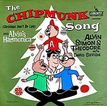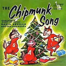 "The Chipmunk Song (Christmas Don't Be Late)" is a novelty Christmas song written by Ross Bagdasarian (under the stage name of David Seville) in 1958. Bagdasarian sang and recorded the song, varying the tape speeds to produce high-pitched "chipmunk" voices, with the vocals credited to Alvin and the Chipmunks, Seville's cartoon virtual band. The song won three Grammy Awards in 1958, for Best Comedy Performance, Best Children's Recording, and Best Engineered Record (non-classical);[1] it was also nominated for Record of the Year.[2]