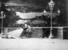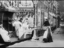 Special effects used in the film include pyrotechnics, artificial snow, superimpositions, and dissolves.[3] The film is also notable for including a cross-section set, allowing Méliès to show both the inside and the outside of the bakery; other Méliès films featuring cross-section scenery include The Impossible Voyage, A Roadside Inn, The Chimney Sweep, and Tunnelling the English Channel.[4] Another scenic effect occurs when the rag-and-bone man comes across the beggar girl; when he turns on his lantern to get a better look at her, a simulated stream of light, painted in white on the scenery, is added using a substitution splice.[5]