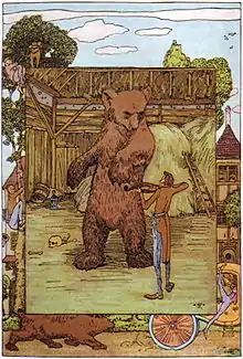 The princess demanded that he spend the night with a bear as well. In his stall, the tailor began to crack nuts. He offered the bear not nuts but pebbles, and the bear could not crack them. The tailor took one away, substituted a nut, and cracked it. The tailor began to fiddle, and the bear danced. The tailor offered to teach it, but first he had to cut its nails. He trapped it in a vise and left it there.