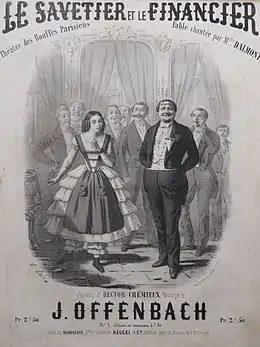 Later in the 19th century, Jacques Offenbach, having already set the fable for soloist and small orchestra as part of his 6 fables de la Fontaine in 1842,[25] wrote the music for a one-act comic opera, Le financier et le savetier (1856), with a script by Hector-Jonathan Crémieux[26] in which the heroine sings a parody of his own setting. In that light-hearted entertainment, the cobbler turns the tables on his opponent by using the 300 crowns he is given to beat the financier at cards, taking over all his assets and winning the hand of his daughter, Aubépine.[27] It was followed in about 1870 by a one-act bouffonerie musicale (knock-about musical) by (Mme) Sounier Geoffroy.[28]