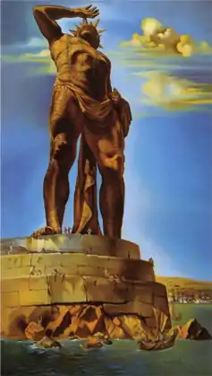 The painting shows the Colossus of Rhodes standing on a base of unworked ashlar.[31] The perspective is from below the statue's base, suggesting that the viewer is on a boat approaching the city, and emphasising the statue's extreme height and size.[32] A piece of drapery wraps around the waist of Helios and hangs from his left arm, falling down to touch the ground behind him.[14] Helios raises his right hand to shield his eyes from the sun over which he reigns, giving what the art historian Eric Shanes terms "a vaguely Surrealist touch" to Dalí's work.[32] In the lower right Dalí signed and dated the work "Salvador Dalí / 1954".[19]