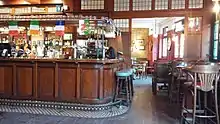 Photograph taken inside The Commercial pub in Herne Hill in March 2018, showing the historic 1930s interior saloon bar, bar counter and chequered gutter.