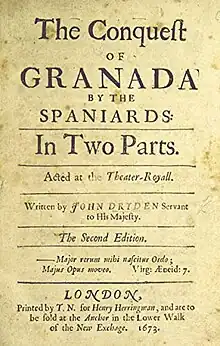 The Conquest of Granada by the Spaniards (1672), by John Dryden, is a two-part tragedy about the Spanish conquest of Granada (1482–1491), and the fall of Muhammad XII of Granada, the last Nasrit ruler of the Emirate of Granada (1230–1492), in southern Iberia. As a stageplay from the period of the English Restoration (1660), The Conquest of Granada is an example of the heroic drama genre in which the playwright Dryden was a pioneer writer; the first performance of the play was in 1670 and the first publication of the play was in 1672.